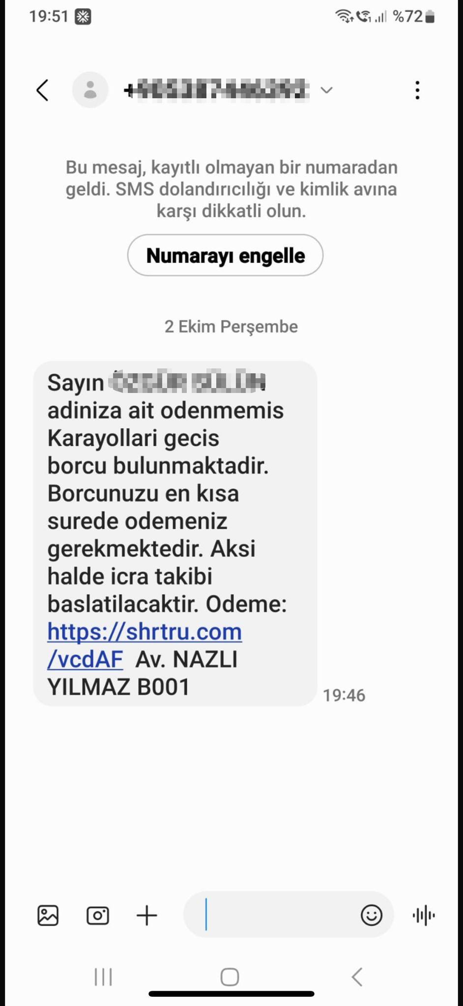 Adana’da görev yapan Avukat Nazlı Yılmaz, son dönemde adının izinsiz kullanıldığını fark etti. Vatandaşlara “Karayollarına geçiş borcunuz bulunmaktadır. Borcunuzu en kısa zamanda ödeyiniz. Aksi takdirde icra takibi yapılacaktır” içerikli sahte mesajlar gönderiliyordu. Mesajların sonunda “Avukat Nazlı Yılmaz” imzası ile sahte ödeme linki yer alıyordu. Dolandırıcılar, linke tıklatıp kişisel bilgileri ele geçirerek para transferi talep ediyordu.