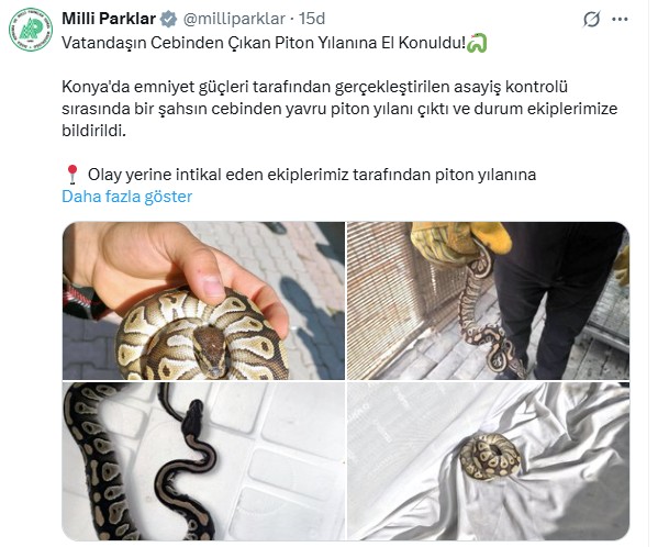 Konya’da rutin asayiş kontrolü sırasında polis ekipleri, bir şahsın cebinden yavru piton yılanı çıkması üzerine durumu Tarım ve Orman Bakanlığı Doğa Koruma ve Milli Parklar Genel Müdürlüğü’ne bildirdi. Şüpheli, yılanı cebinde saklamaya çalışırken fark edildi. Ekipler, olay yerine intikal ederek pitonu teslim aldı.