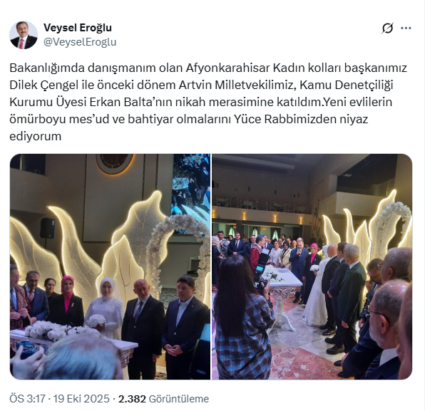 “Bakanlığımda danışmanım olan Afyonkarahisar Kadın kolları başkanımız Dilek Çengel ile önceki dönem Artvin Milletvekilimiz, Kamu Denetçiliği Kurumu Üyesi Erkan Balta’nın nikah merasimine katıldım. Yeni evlilerin ömür boyu mes’ud ve bahtiyar olmalarını Yüce Rabbimizden niyaz ediyorum.”